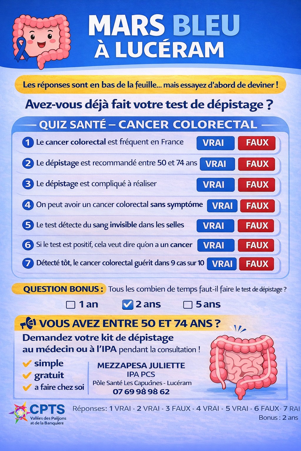 Dans le cadre de la campagne nationale Mars Bleu, dédiée à la sensibilisation au dépistage du cancer colorectal, Le Pôle Santé Les Capucines met à disposition des habitants de Lucéram un flyer d’information et de prévention.